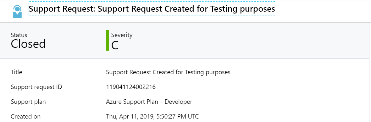 The designated approver can also select the SERVICE REQUEST ID to view the support ticket request that was created by the original user. This information provides context for why Microsoft Support is engaged, and the history of the reported problem. For example: