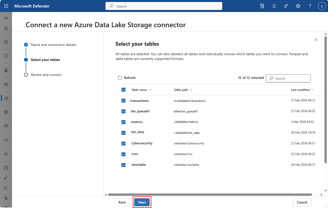 After creating a connector instance check that the tables you federated are available in Microsoft Sentinel.