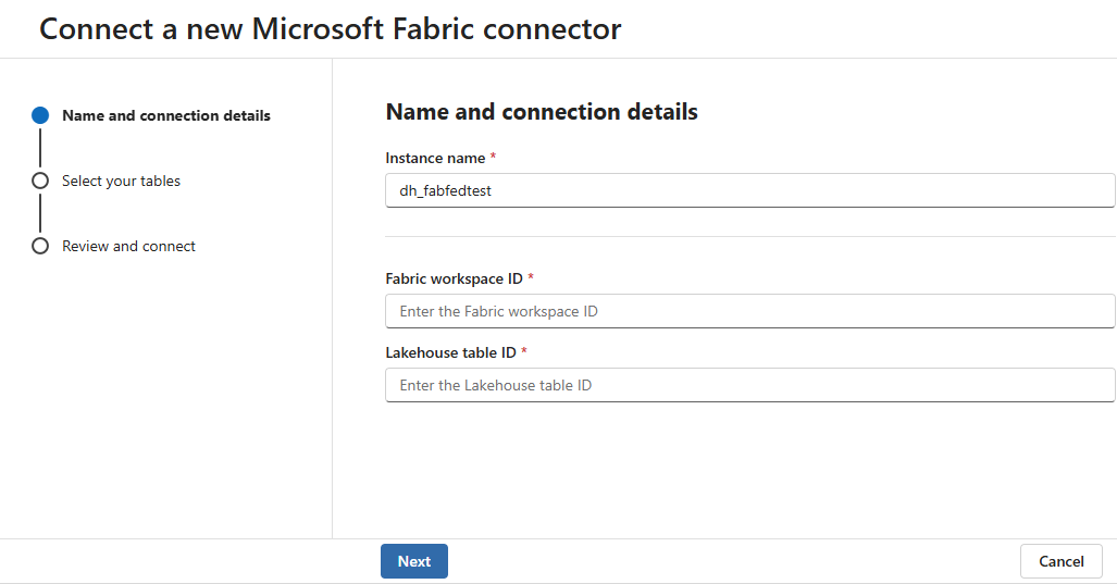 Field Description Instance name A friendly name for this connector instance. This instance name is appended to the tables represented in the lake from this instance. Fabric workspace ID ID of the Fabric workspace to federate. When you navigate to the Fabric workspace or Lakehouse, the workspace ID is in the URL after /groups/Lakehouse table ID ID of the Fabric Lakehouse table to federate. When you navigate to the Fabric lakehouse, the lakehouse ID is shown in the URL after /lakehouses/.Select Next.
