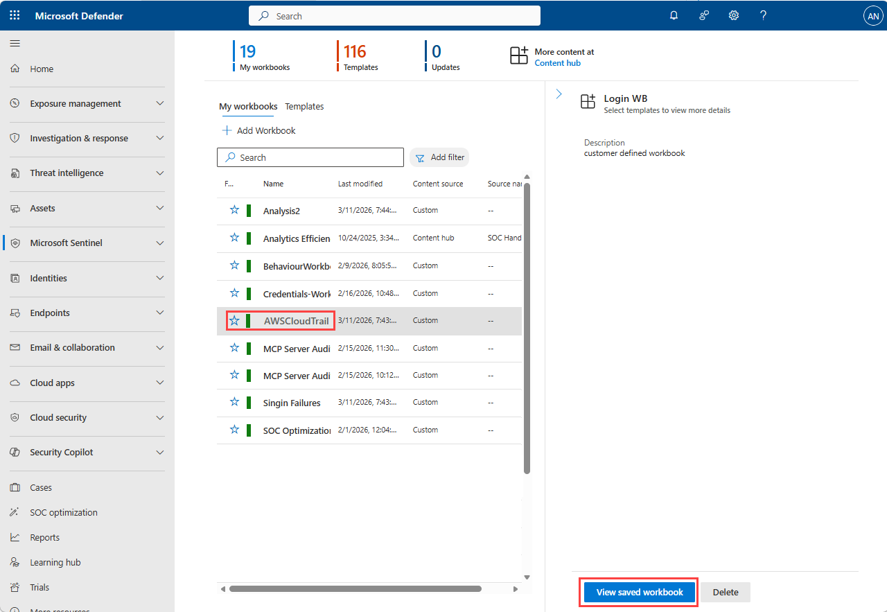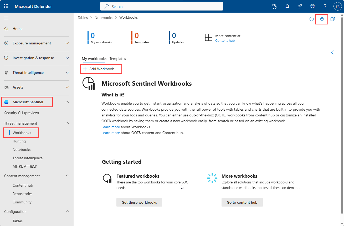 In the Defender portal, go to Microsoft Sentinel > Threat management > Workbooks.
