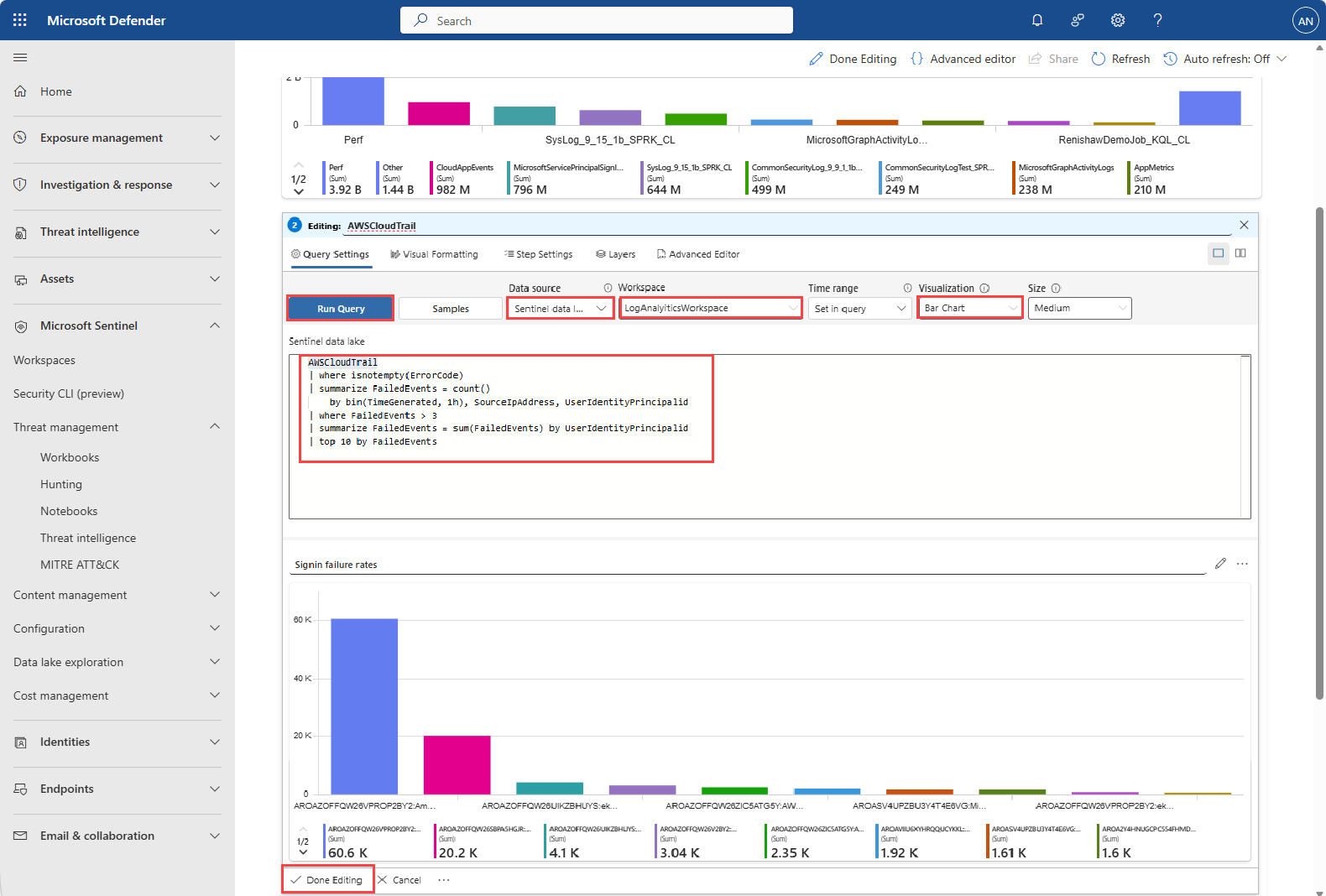 AWSCloudTrail | where isnotempty(ErrorCode) | summarize FailedEvents = count() by bin(TimeGenerated, 1h), SourceIpAddress, UserIdentityPrincipalid | where FailedEvents > 3 | summarize FailedEvents = sum(FailedEvents) by UserIdentityPrincipalid | top 10 by FailedEventsUnder Visualization select Bar chart.