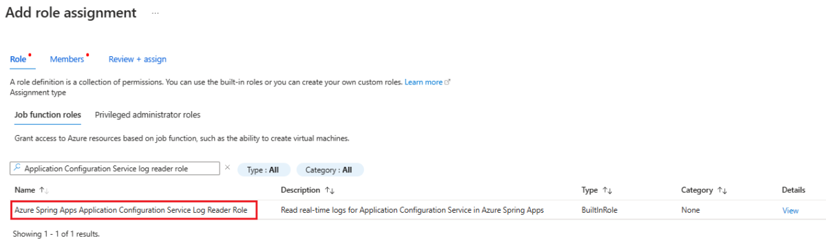 | Application Configuration Service | Azure Spring Apps Application Configuration Service Log Reader Role | Microsoft.AppPlatform/Spring/ApplicationConfigurationService/logstream/action |