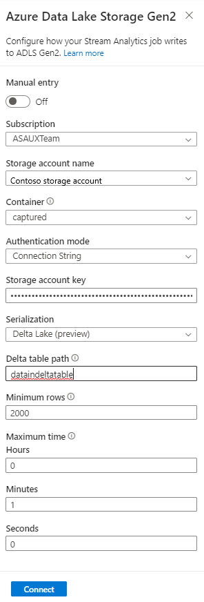 This article explains how to use the no code editor to automatically capture streaming data in Event Hubs in an Azure Data Lake Storage Gen2 account in Delta Lake format.