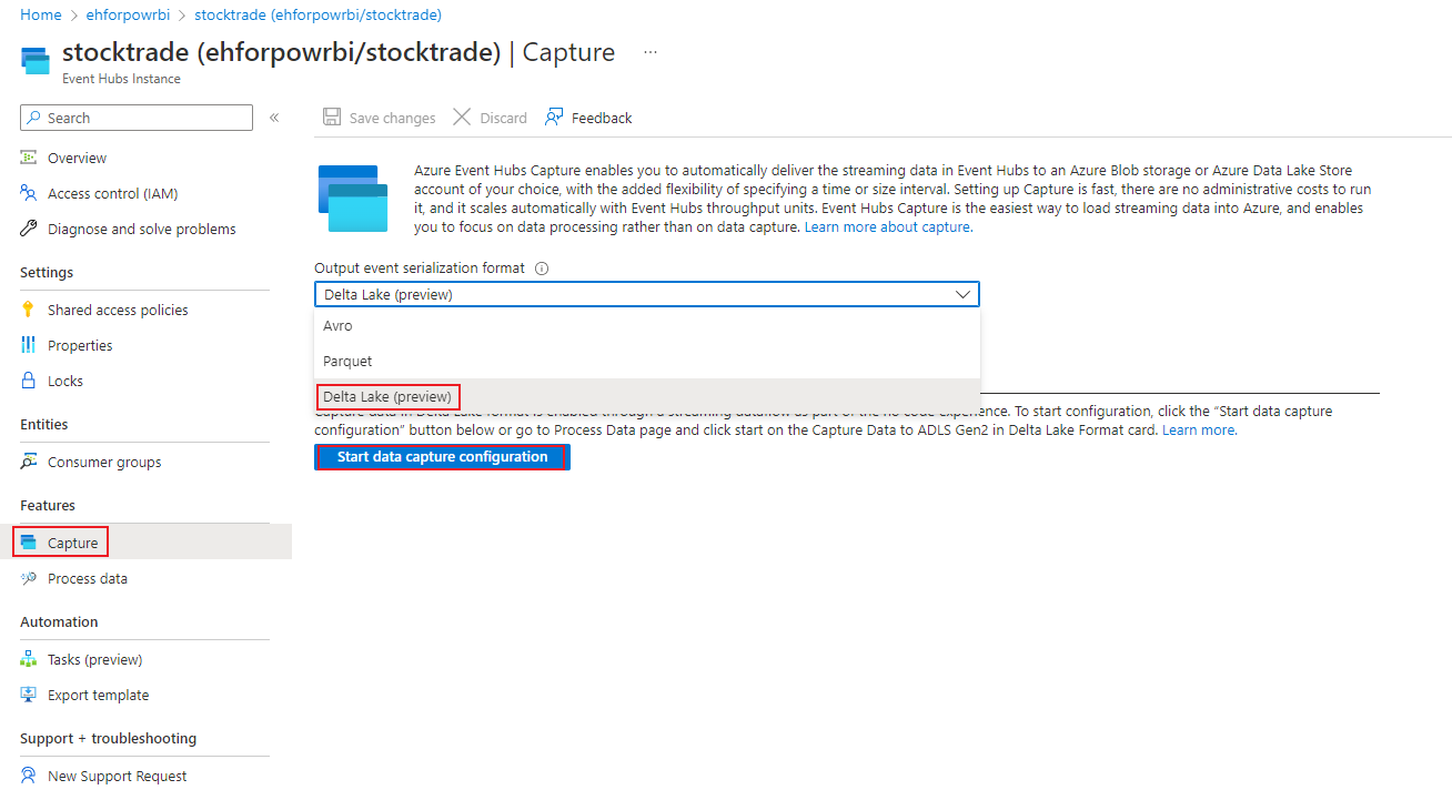 Alternatively, select Features > Capture, and select Delta Lake option under "Output event serialization format", then select Start data capture configuration.