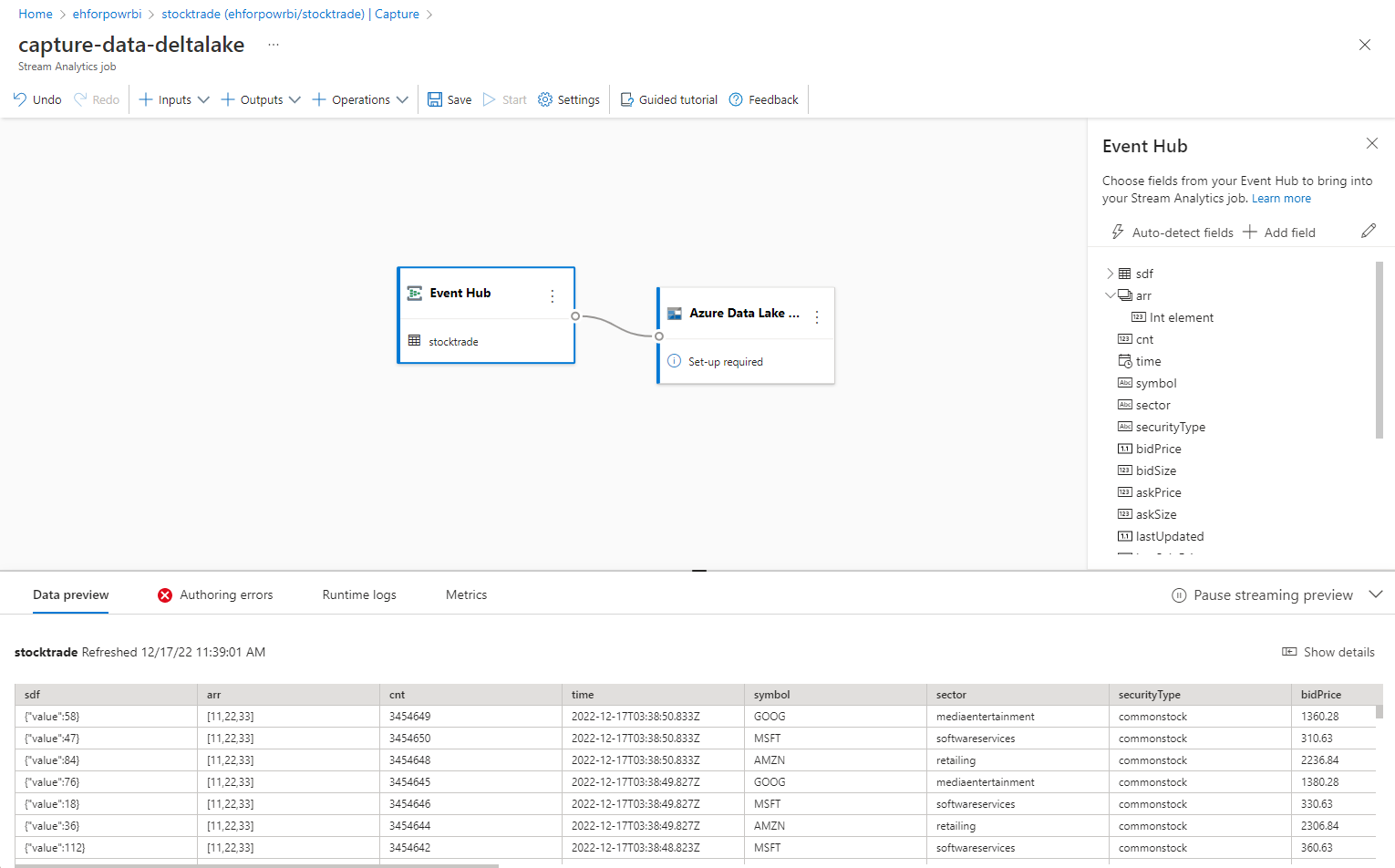 - A live sample of incoming data in the Data preview table under the diagram view. It refreshes periodically. You can select Pause streaming preview to view a static view of the sample input.