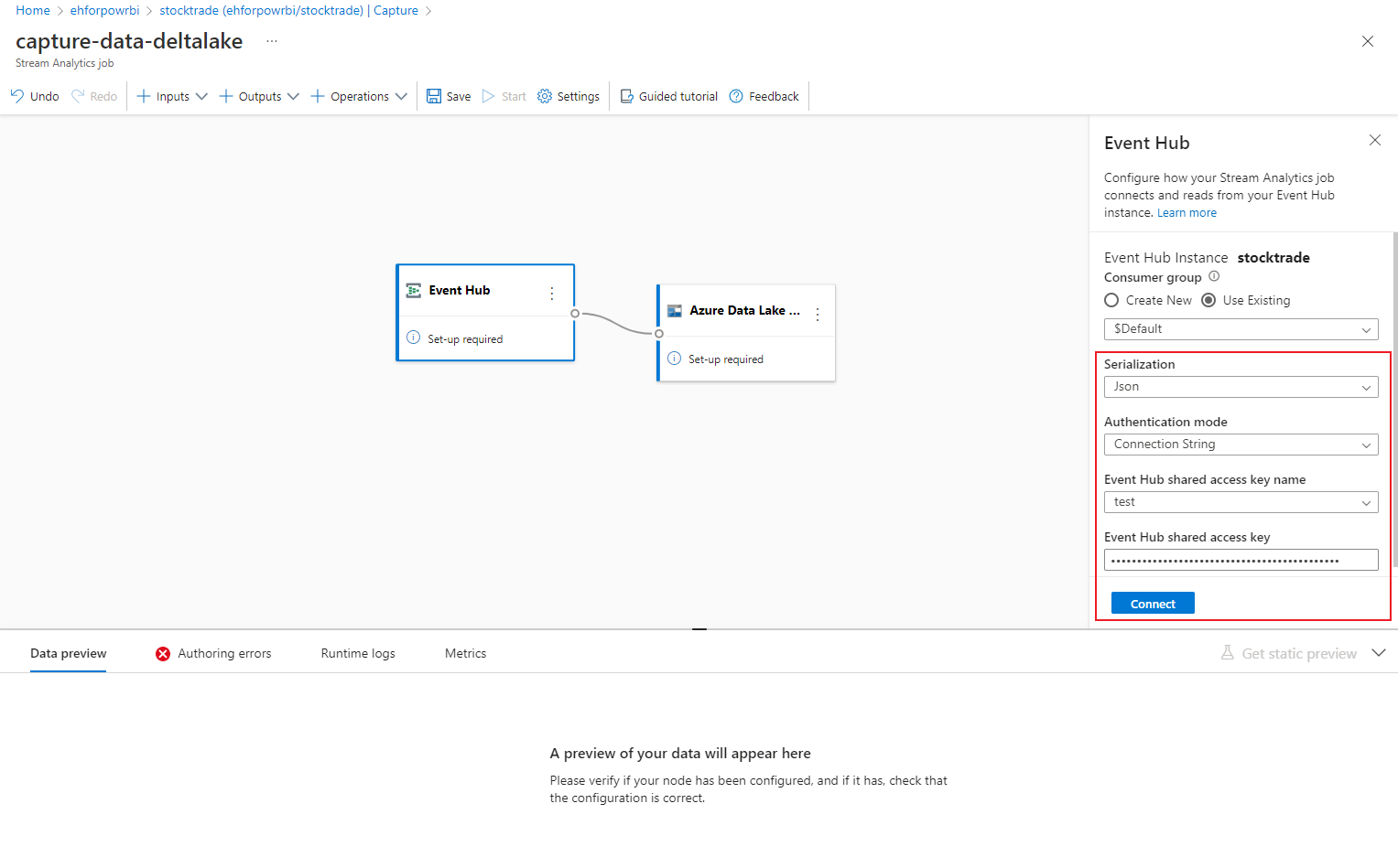 Specify the Serialization type of your data in the Event Hubs and the Authentication method that the job uses to connect to Event Hubs. Then select Connect.