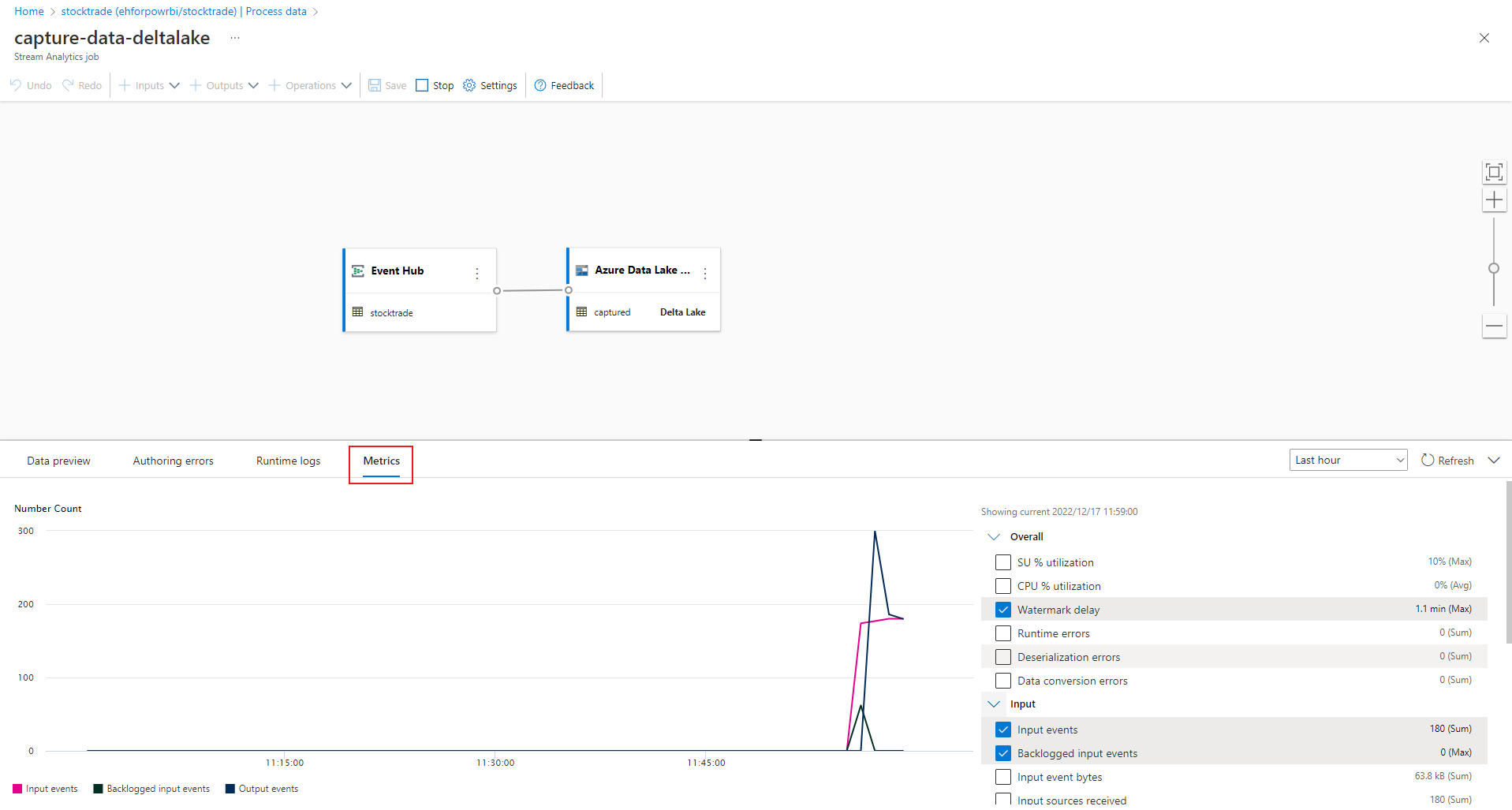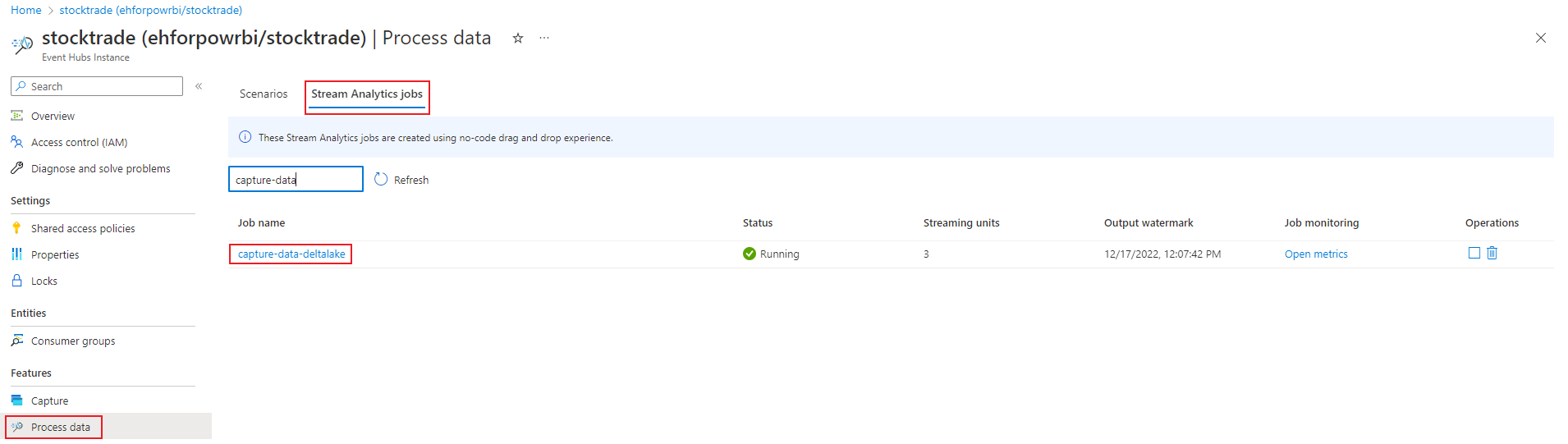 Now you know how to use the Stream Analytics no code editor to create a job that captures Event Hubs data to Azure Data Lake Storage Gen2 in Delta lake format. Next, you can learn more about Azure Stream Analytics and how to monitor the job that you created.