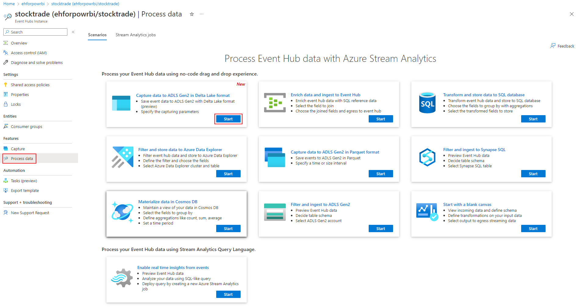 Select Features > Process Data, and select Start on the Capture data to ADLS Gen2 in Delta Lake format card.