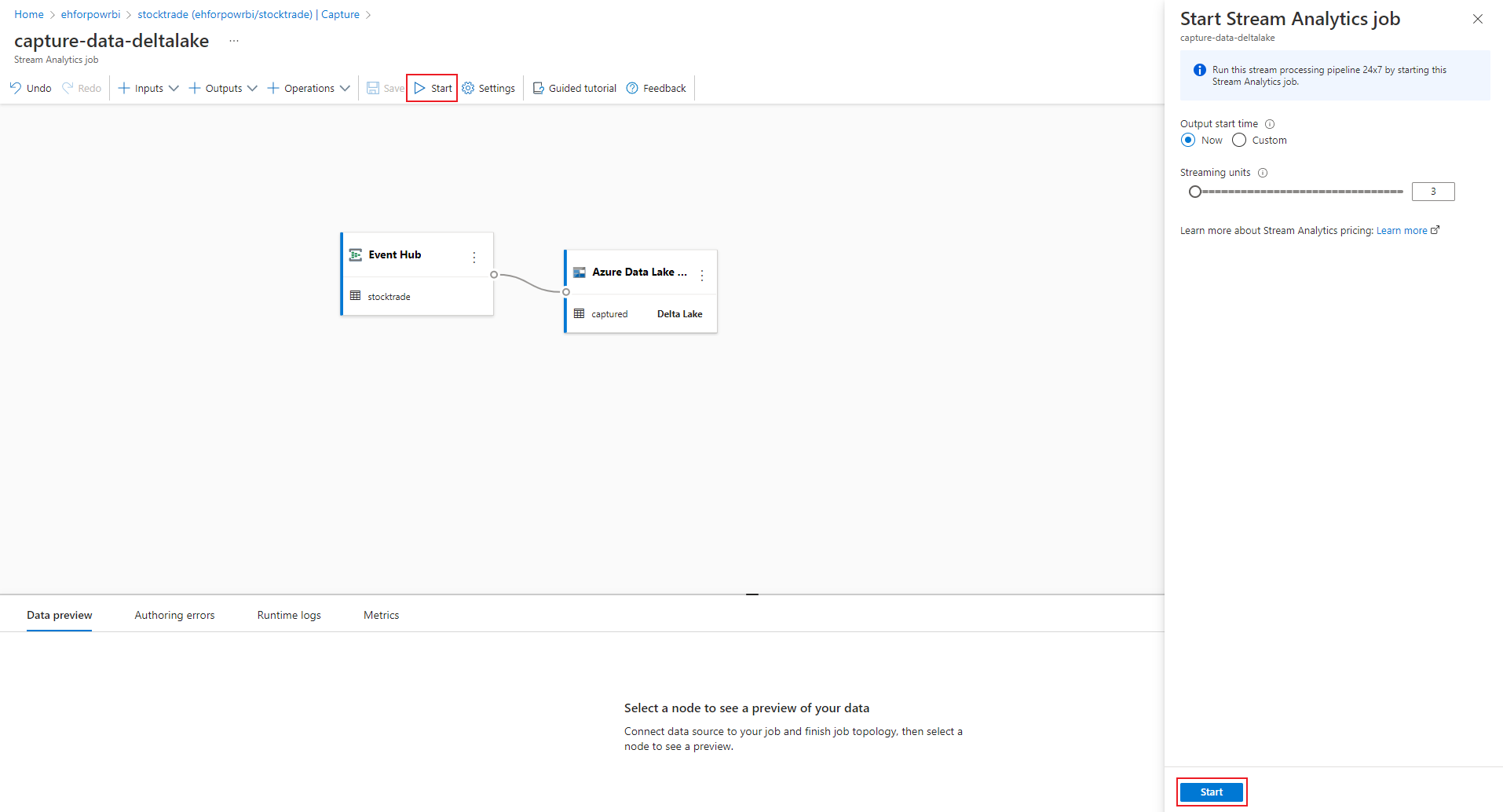 Select Start on the command bar to start the streaming flow to capture data. Then in the Start Stream Analytics job window: