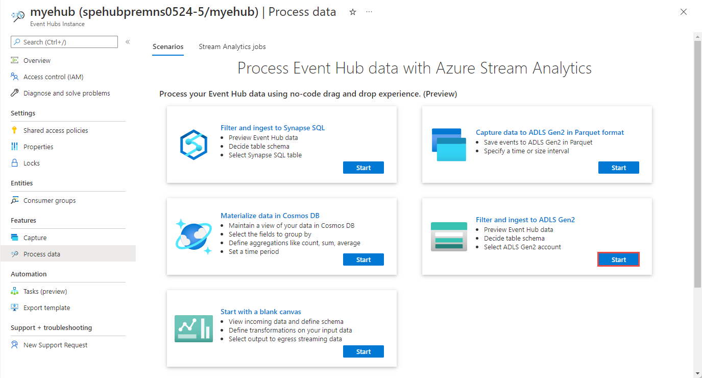 Select Features > Process Data and then select Start on the Filter and ingest to ADLS Gen2 card.