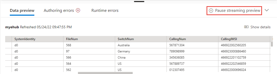- A live sample of incoming data in Data preview table under the diagram view. It automatically refreshes periodically. You can select Pause streaming preview to see a static view of sample input data.