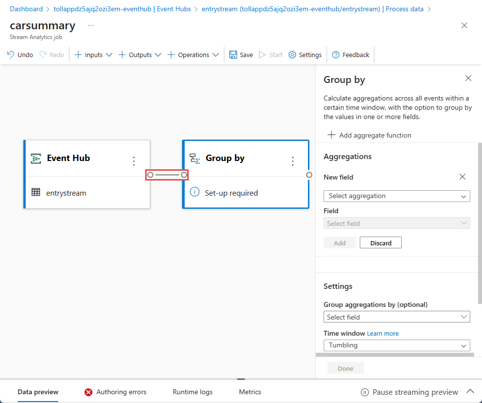 Select the Group by tile on the canvas and connect it to the event hub tile.
