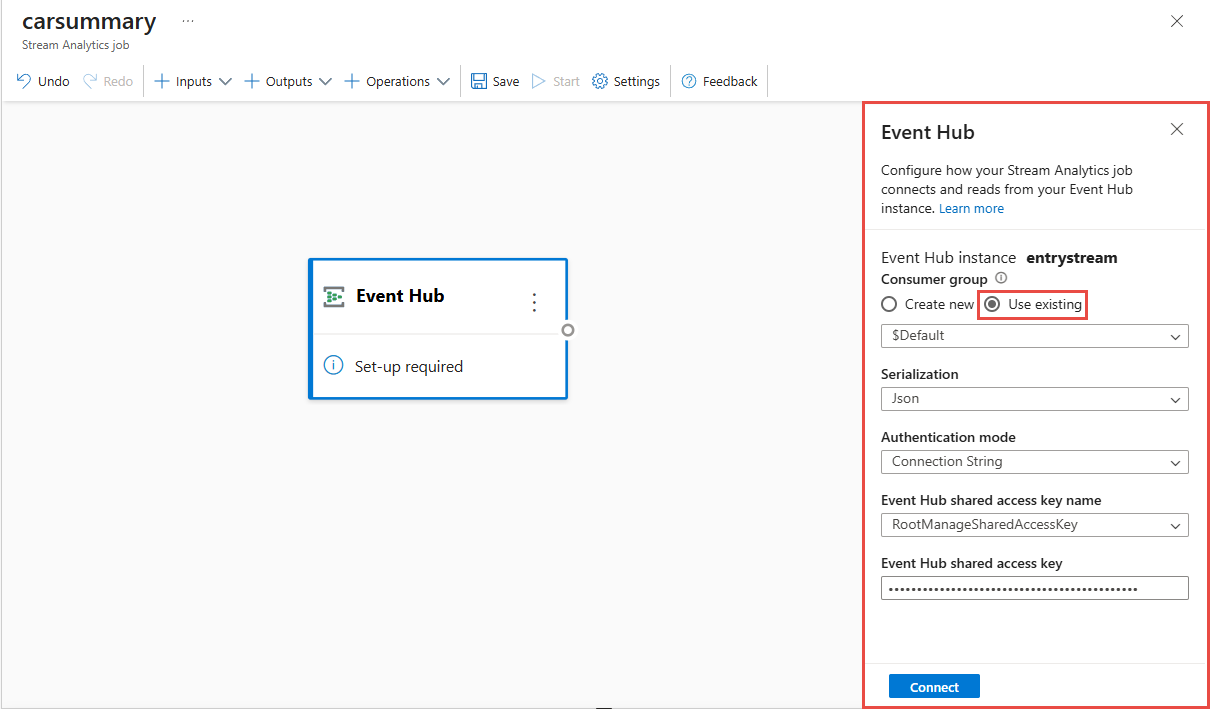 carsummaryand select Create.On the event hub configuration page, confirm the following settings, and then select Connect.
