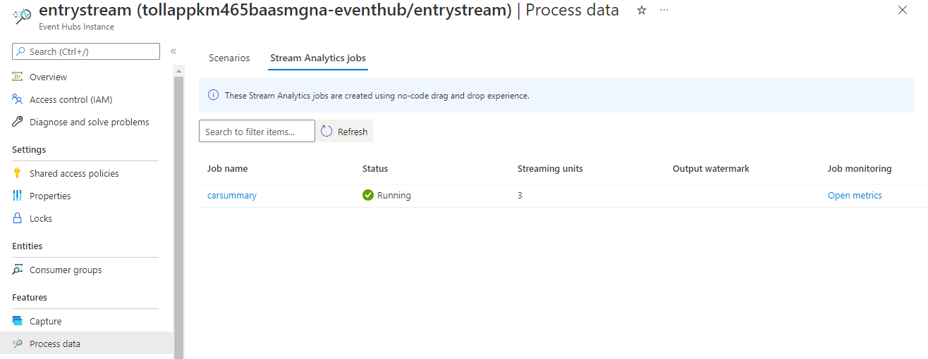 You then see a list of all Stream Analytics jobs created using the no code editor. And within two minutes, your job goes to a Running state. Select the Refresh button on the page to see the status change from Created -> Starting -> Running.