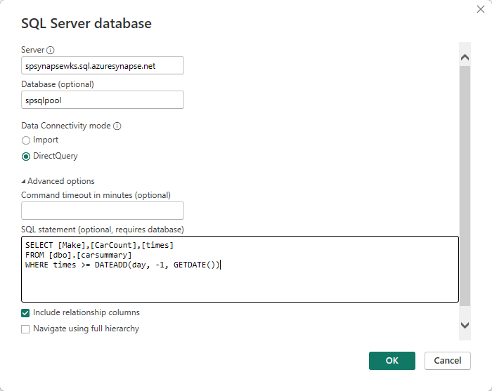 SELECT [Make],[CarCount],[times] FROM [dbo].[carsummary] WHERE times >= DATEADD(day, -1, GETDATE())Switch to the Database tab, and enter your credentials (user name and password) to connect to the database and run the query.