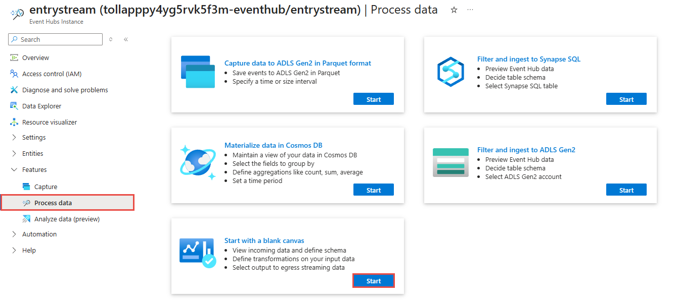 entrystreaminstance.Under the Features section, go to Process data and then select start on the Start with blank canvas template.