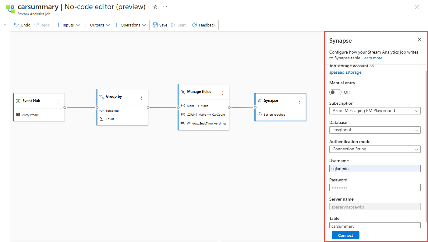 carsummary.Select Connect. You see sample results that are written to your Synapse SQL table.