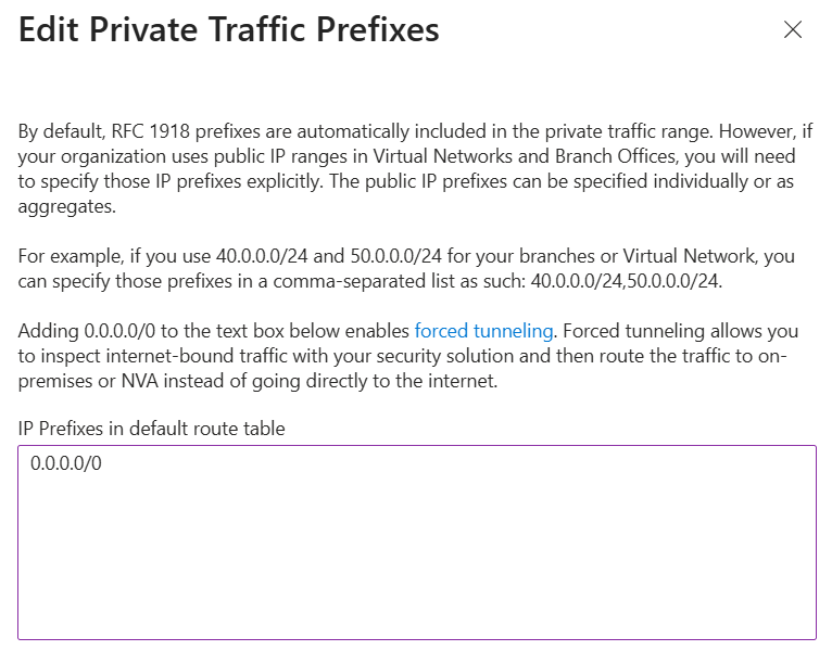 Azure portal performs validations to ensure deployments are either in forced tunnel mode or direct access mode. This means that if forced tunnel mode is enabled, you won't be able to add an Internet policy directly. To migrate from forced tunnel mode to direct access mode, execute the following steps in order: remove the 0.0.0.0/0 static route from additional prefixes, enable internet policy and save.