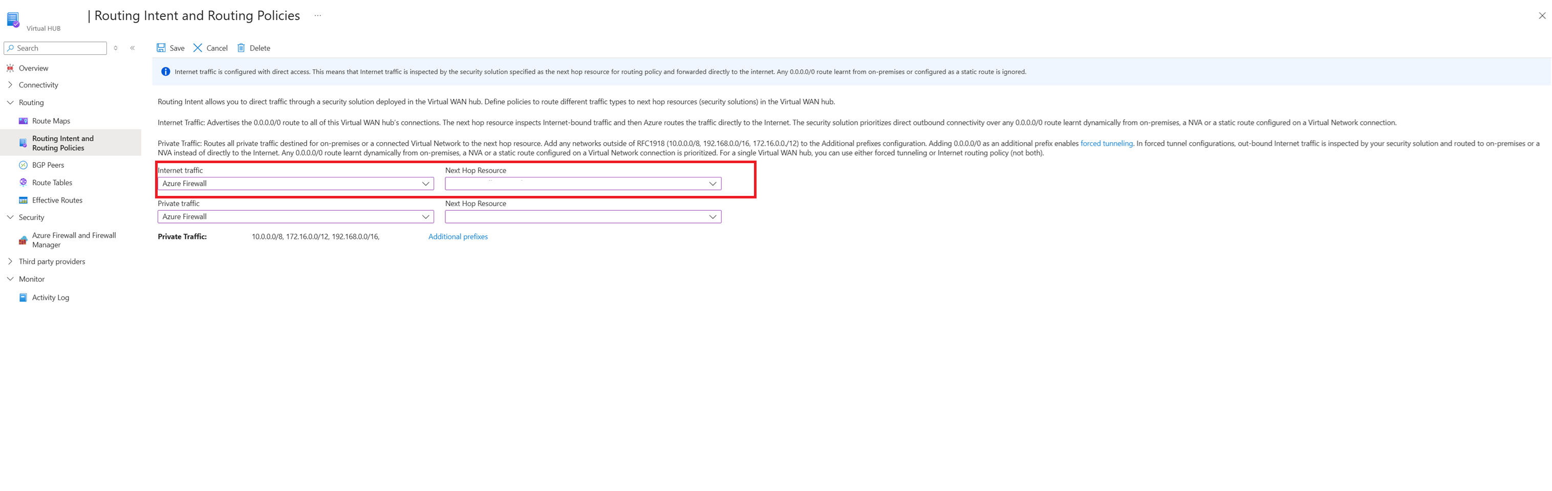 Virtual WAN routing intent allows you to send Private and Internet traffic to security solutions deployed in the Virtual WAN hub.