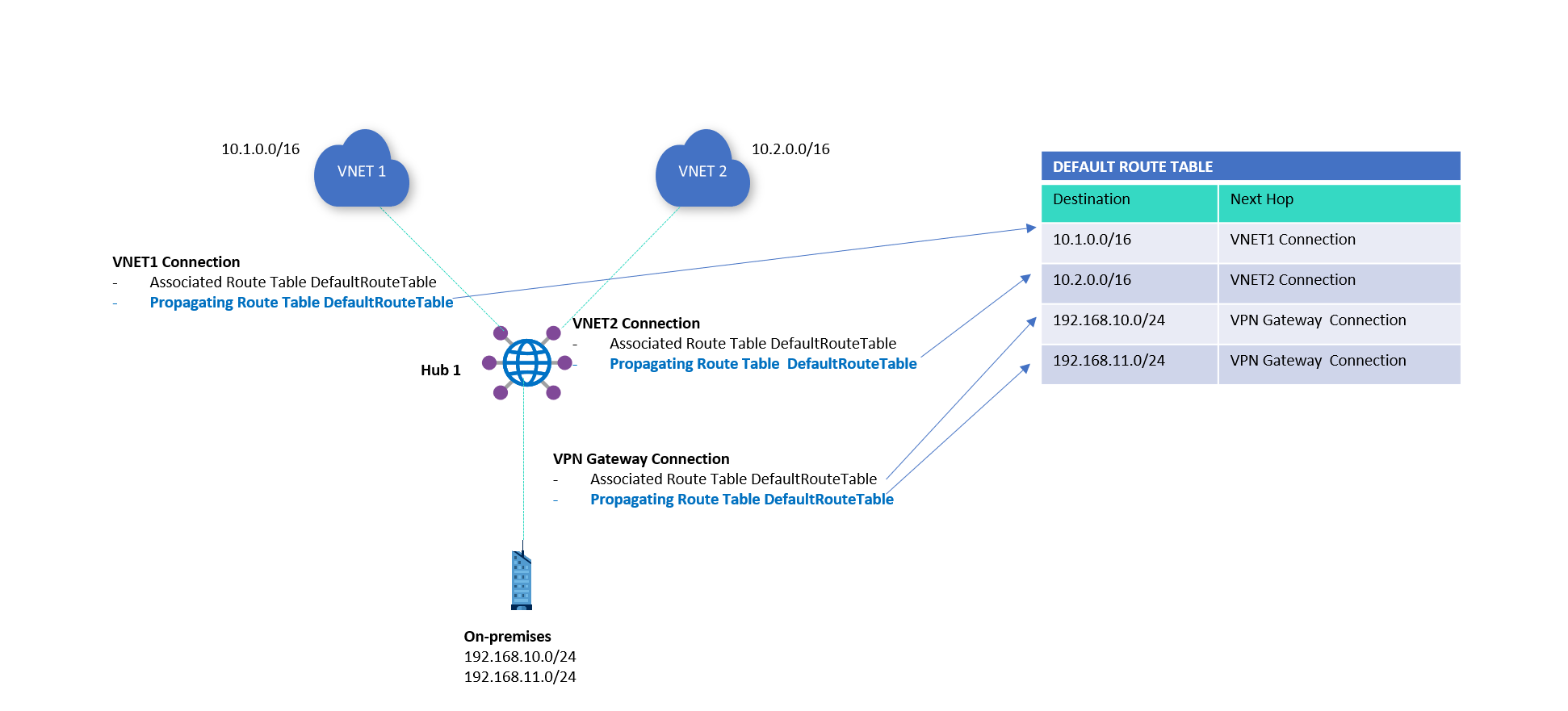 You can set up the routing configuration for a virtual network connection during setup. By default, all connections associate and propagate to the Default route table.