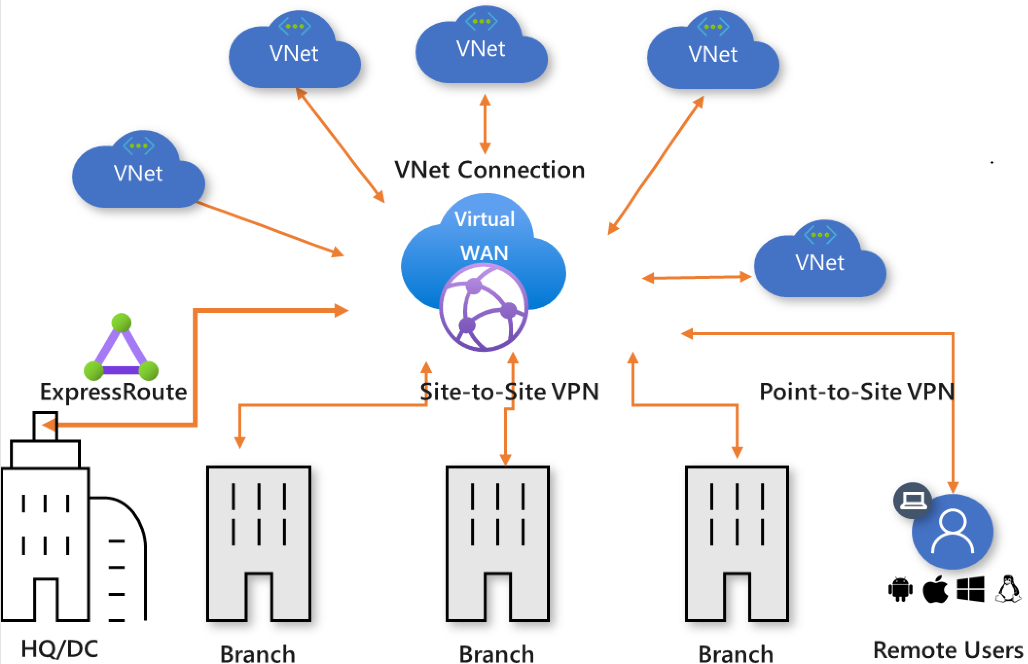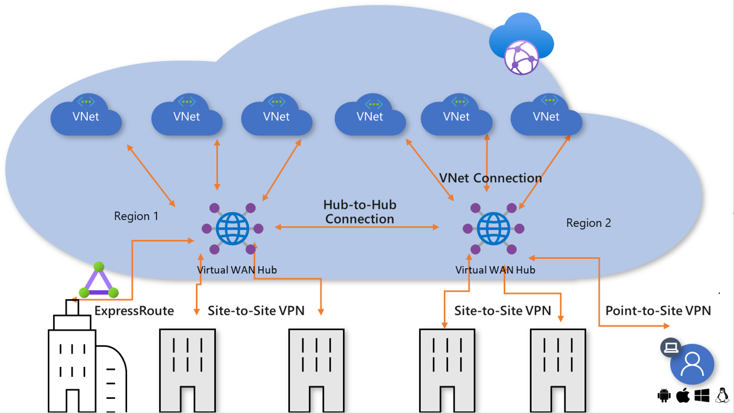 In the Azure Virtual WAN architecture, virtual WAN hubs are provisioned in Azure regions, to which you can choose to connect your branches, VNets, and remote users. The physical branch sites are connected to the hub by Premium or Standard ExpressRoute or site-to site-VPNs, VNets are connected to the hub by VNet connections, and remote users can directly connect to the hub using User VPN (point-to-site VPNs). Virtual WAN also supports cross-region VNet connection where a VNet in one region can be connected to a virtual WAN hub in a different region.