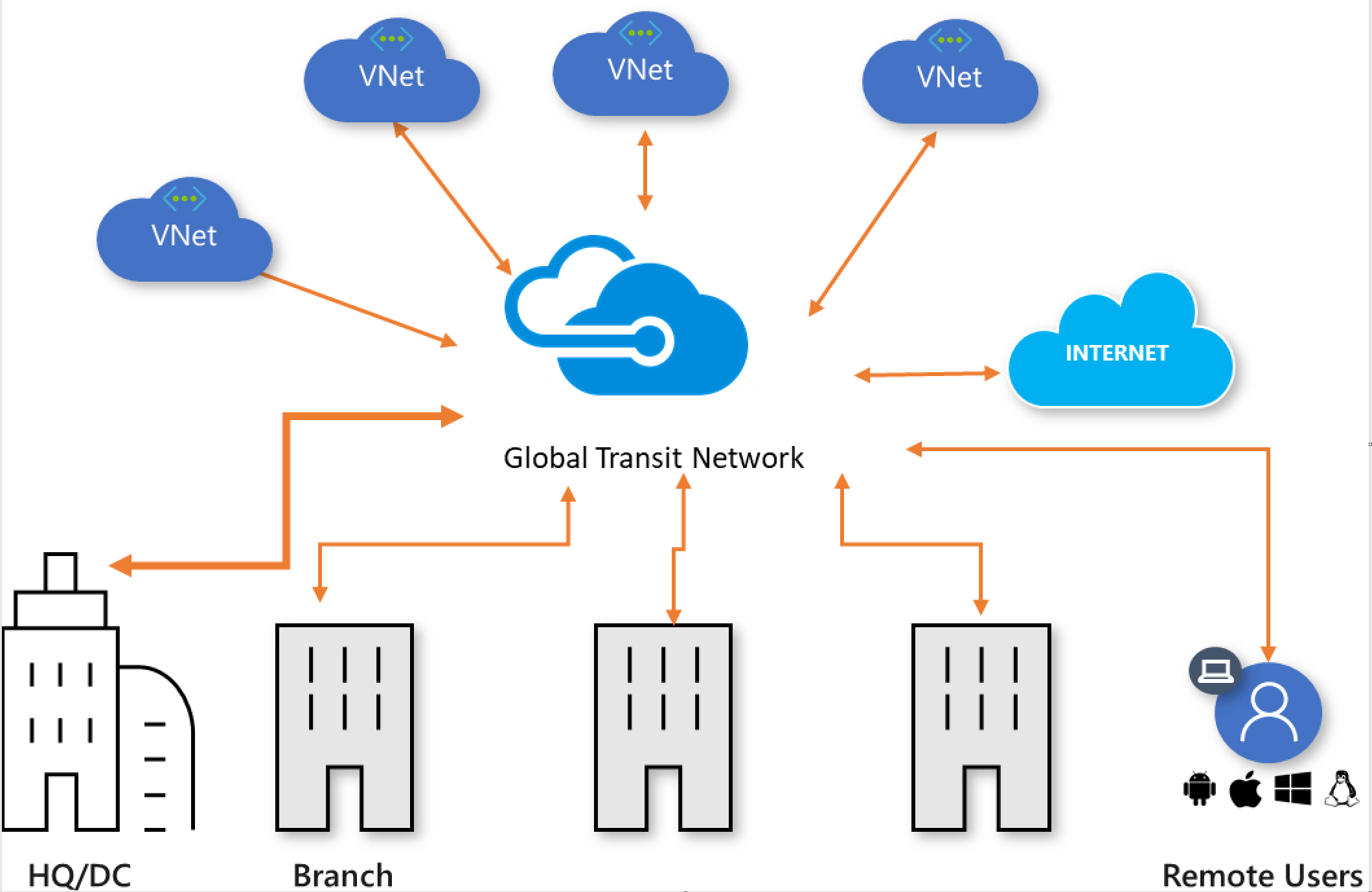 Any-to-any connectivity (in the context of a global architecture) allows an enterprise with globally distributed users, branches, datacenters, VNets, and applications to connect to each other through the “transit” hub(s). Azure Virtual WAN acts as the global transit system.