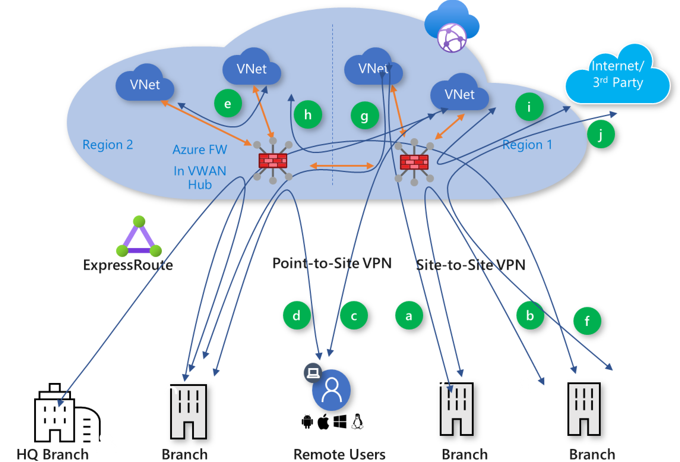 Virtual WAN supports the following global secured transit connectivity paths. While the diagram and traffic patterns in this section describe Azure Firewall use cases, the same traffic patterns are supported with Network Virtual Appliances and SaaS security solutions deployed in the hub. The letters in parentheses map to Figure 5.