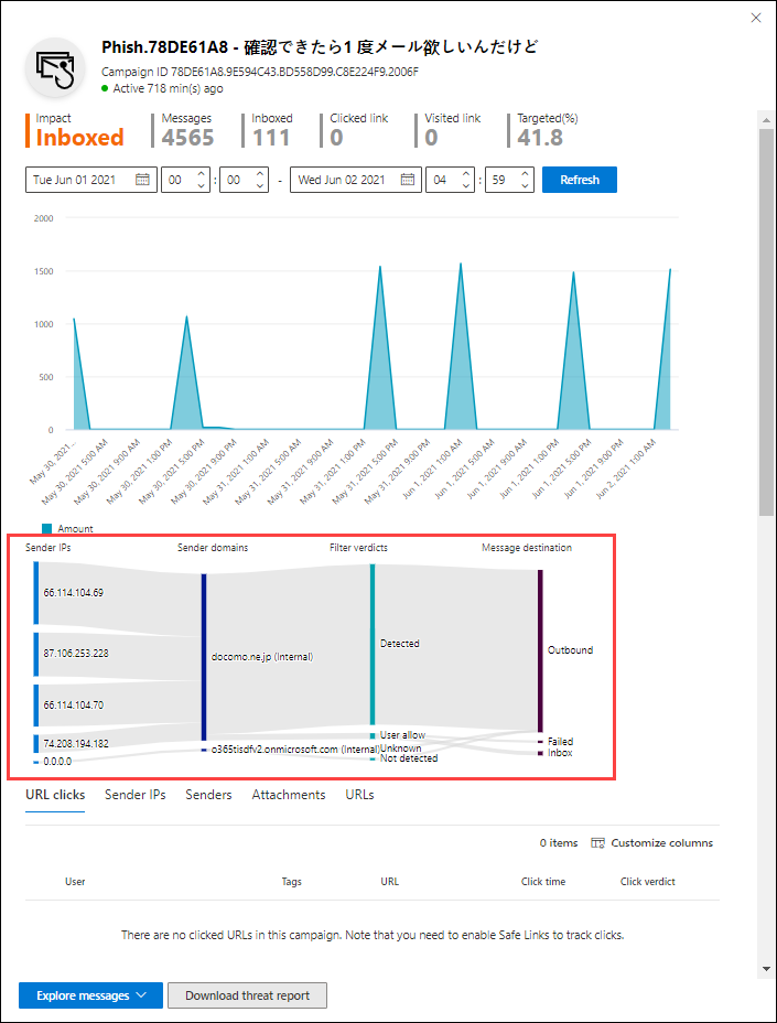 - Inboxed messages: Opens a new Threat Explorer search tab using the Campaign ID and Delivery location: Inbox as the search filter.