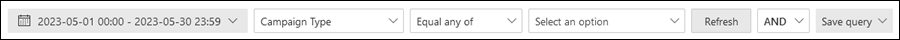 After you select a property from the Campaign Type dropdown, select Equal any of or Not equal any of, and then enter or select a value in the property box, the filter query appears below the filter area.