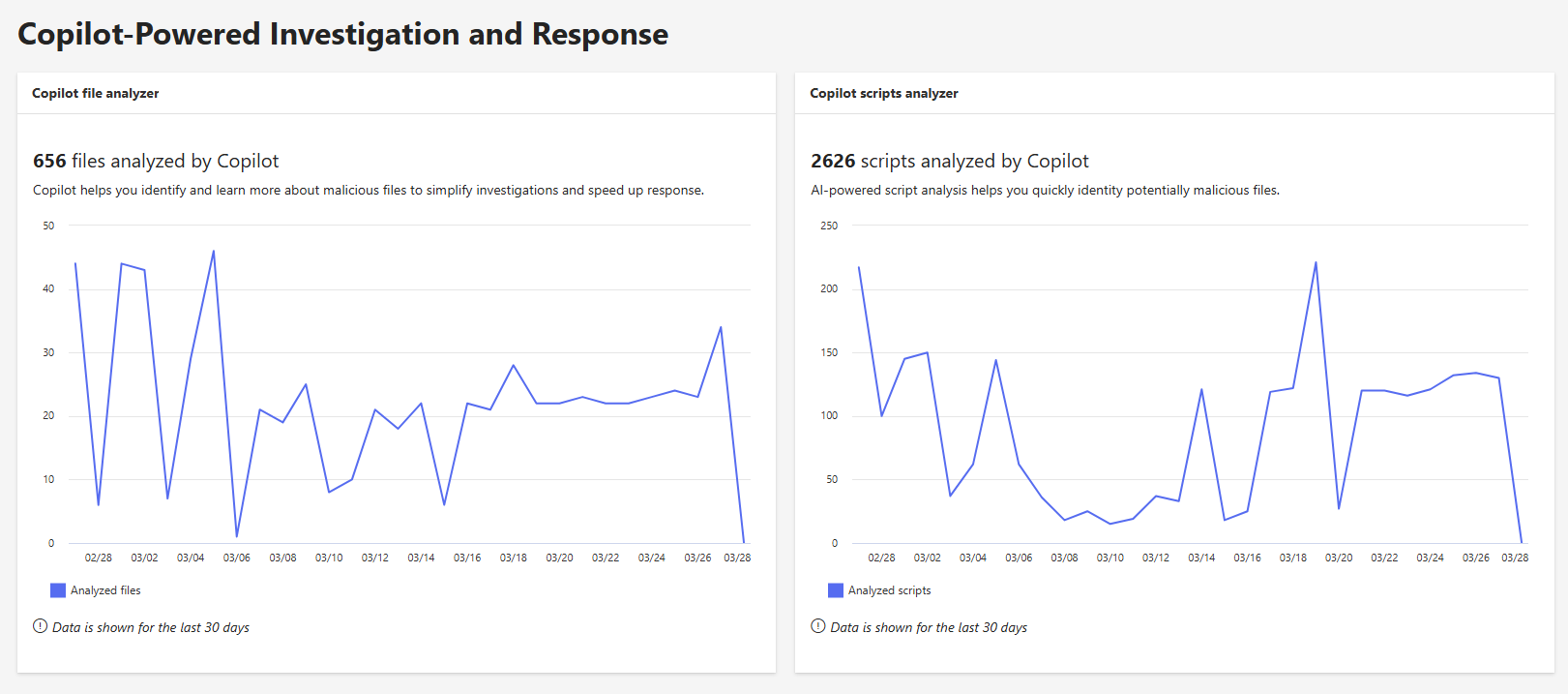 - Copilot-powered investigation and response: This section contains the number of analyzed files and scripts where Microsoft Copilot in Defender was used.