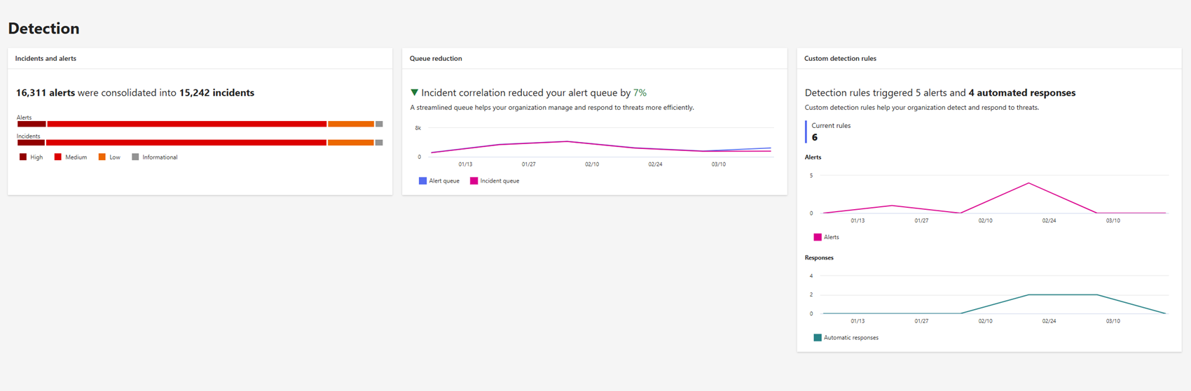 - Detection: This section contains the number of alerts and incidents, including how many alerts were consolidated into incidents, the number of alerts grouped into incidents, and information on active detection rules and the corresponding response actions produced by those rules