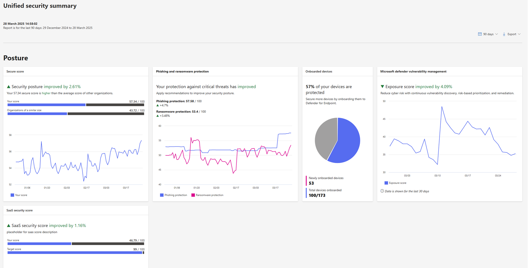 Security operations center (SOC) teams can easily showcase their security achievements and the impact of Microsoft Defender using the unified security summary. Having the summary readily available in the Microsoft Defender portal streamlines the process for SOC teams to generate security reports, saving time usually spent on collecting data from various sources and creating reports tailored to their audiences. SOC teams can readily communicate performance and achievements to their stakeholders with the summary.