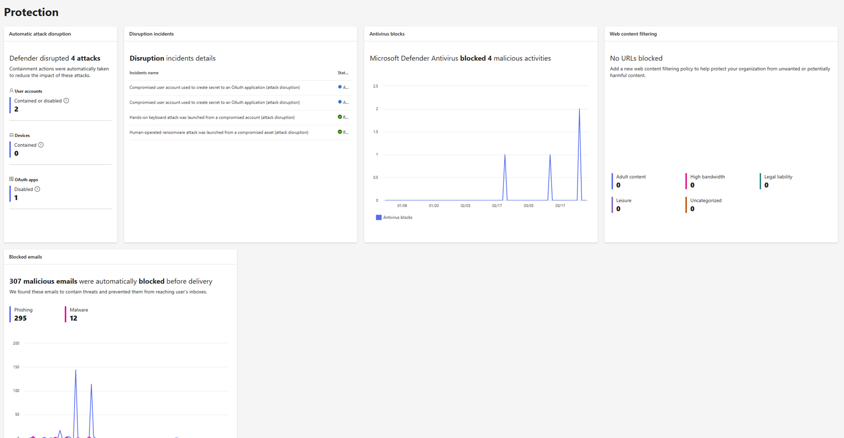 - Protection: Cards under this section include data from Microsoft’s automatic investigation and response features like the total number of attacks disrupted, a list of the disruption incidents, the number of malicious activities blocked by Microsoft Defender Antivirus, and the number of malicious emails and URLs blocked