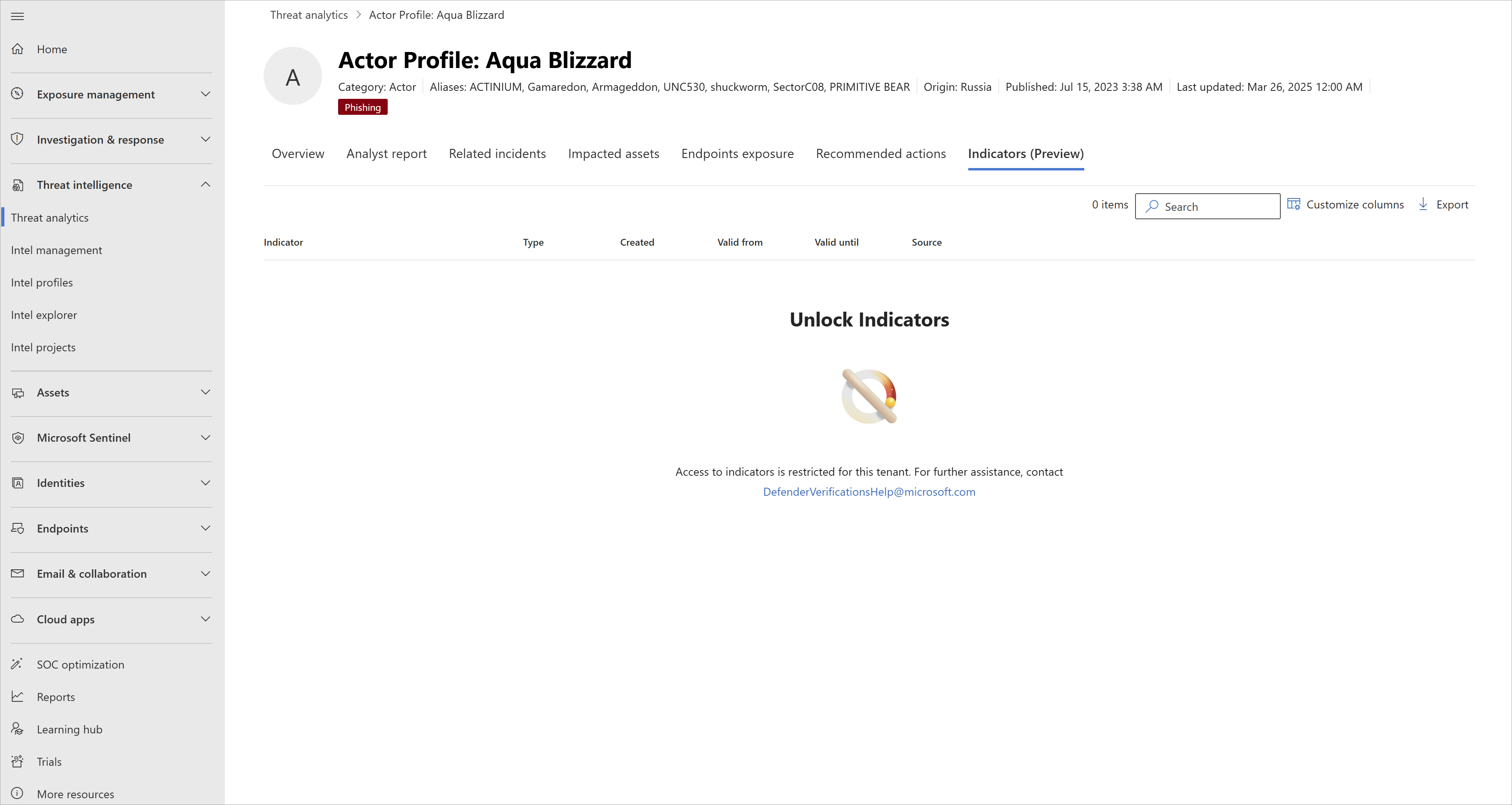 The verification process might take at least an hour. After the process completes, refresh the Indicators tab. If your tenant is validated successfully, you see the list of IOCs displayed in this section.