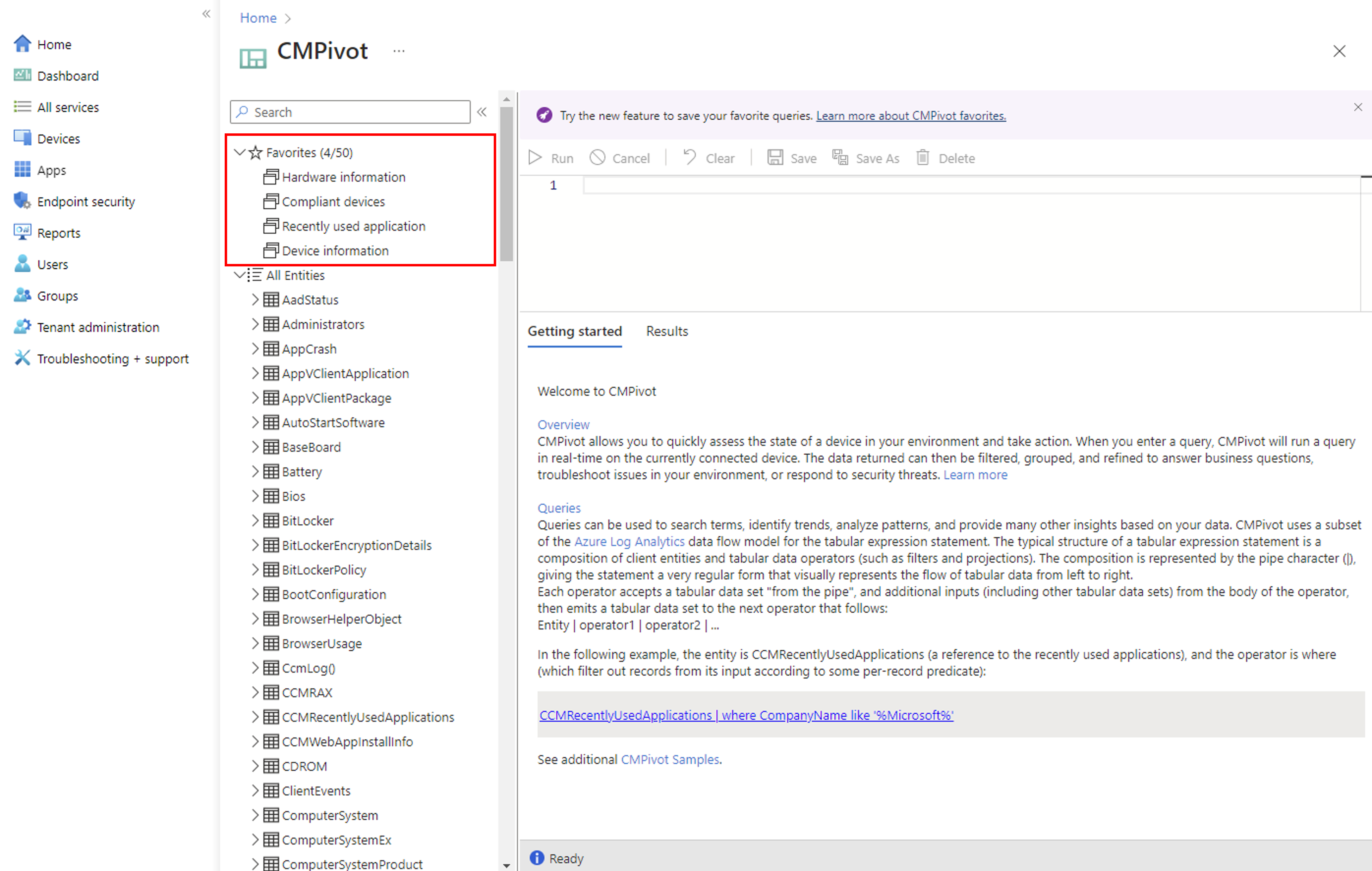 Save your frequently used queries to a Favorites folder in CMPivot to keep all your most used queries in one place. You can also add tags to your queries to help search and find queries.