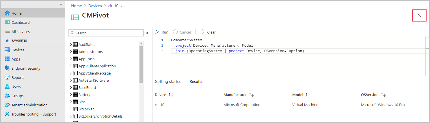 To close CMPivot and return to the device information, use the X icon in the top right of CMPivot.