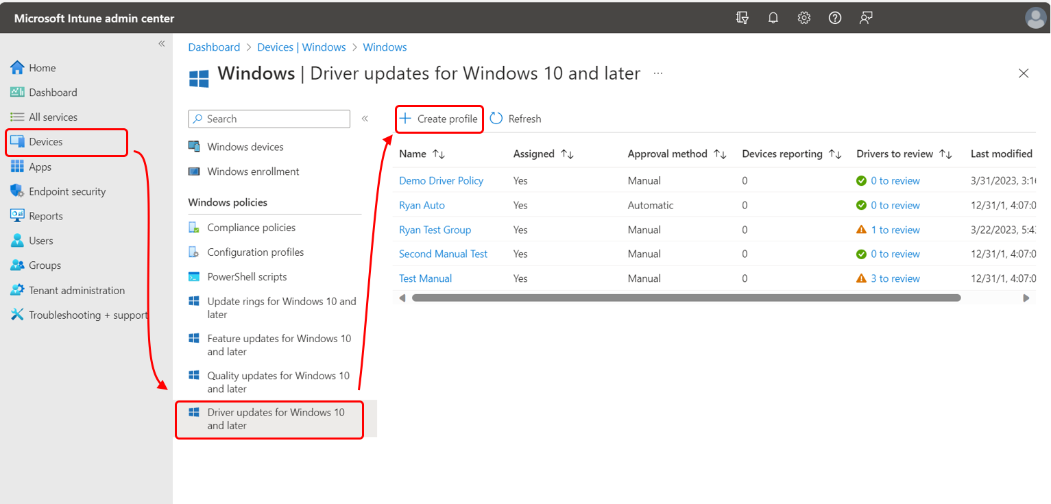 Sign in to the Microsoft Intune admin center and go to Devices > By platform > Windows > Manage updates > Windows 10 and later updates > Driver updates tab, and select Create profile.