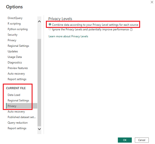 Pasirinkite Dabartinis failo>privatumas ir nustatykite privatumo lygį į Sujungti duomenis pagal kiekvieno šaltinio privatumo lygio parametrus.