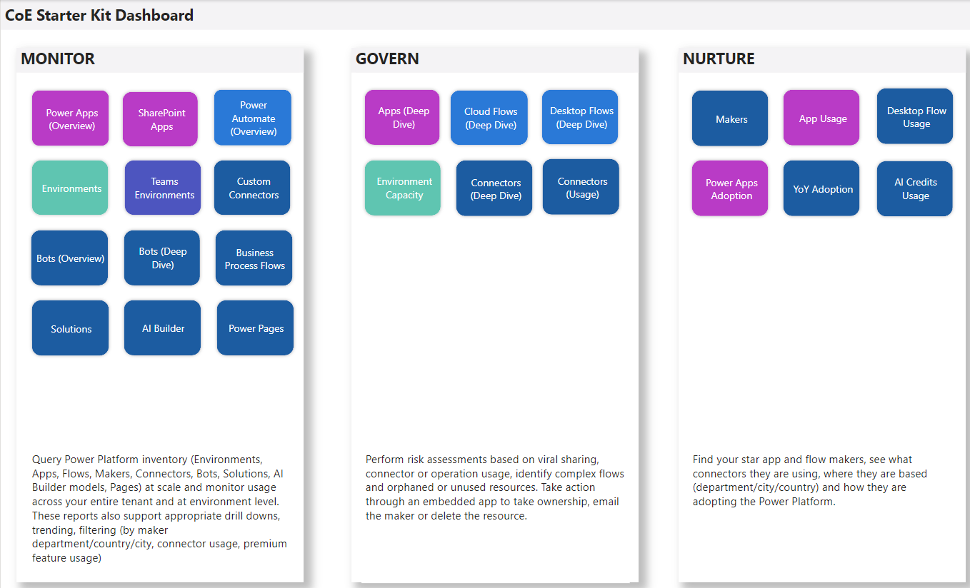 Production_CoEDashboard_MMMYY.pbit ir BYODL_CoEDashboard_MMMYY.pbit ataskaitų sritis galima sukonfigūruoti taip, kad būtų naudojamos įdėtosios programos, kad galėtumėte imtis veiksmų pagal rastas įžvalgas. Naudodami įdėtąsias programas galite suteikti sau prieigą prie išteklių, naikinti programas ir srautus bei susisiekti su kūrėju el. paštu. Prieš naudodami ataskaitų sritį turite sukonfigūruoti Power Apps vaizdinius elementus Power BI .