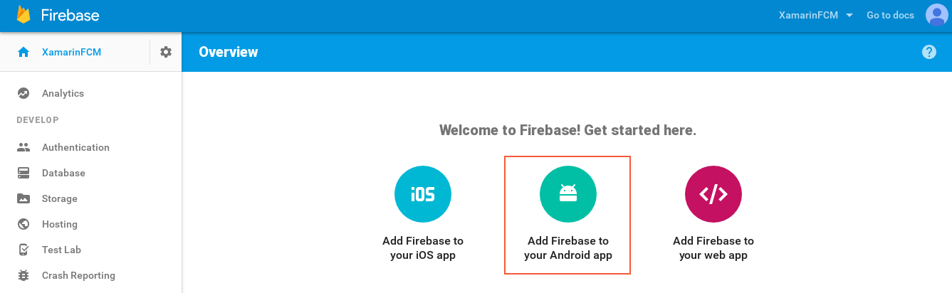 Setting Up Firebase Cloud Messaging (later in this guide) provides detailed instructions for creating a project and generating these credentials. When you create a new project in the Firebase Console, a credentials file called google-services.json is created – add this file to your Xamarin.Android project as explained in Remote Notifications with FCM.