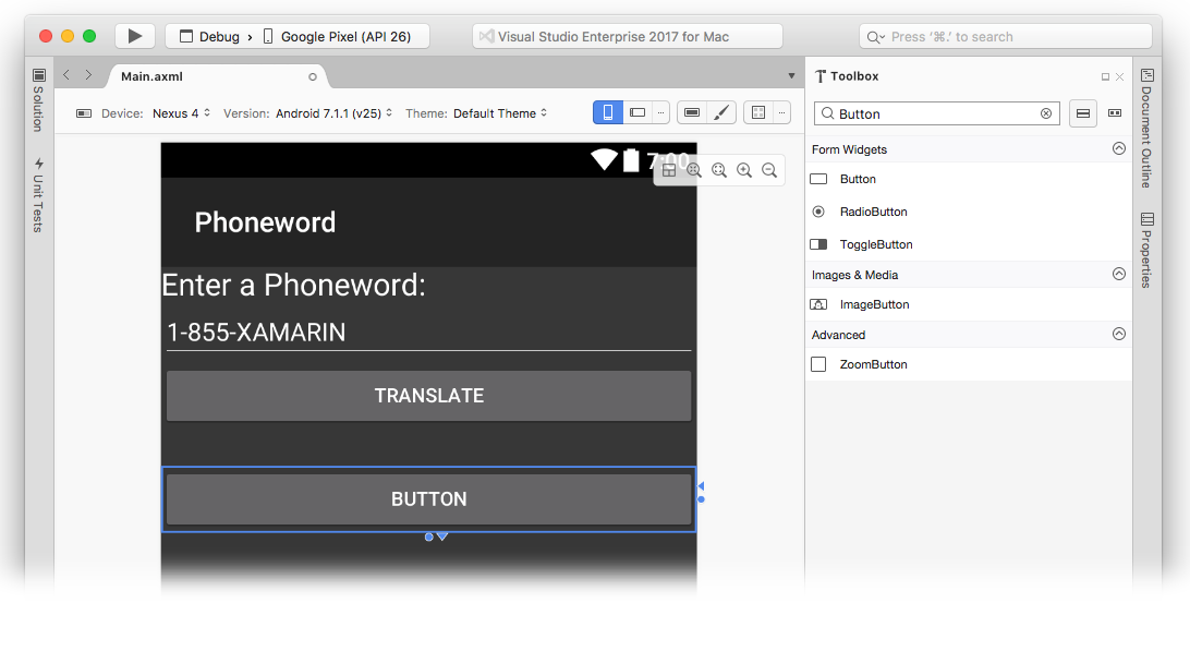 Start by opening the Phoneword project in Visual Studio for Mac and editing the Main.axml file from the Solution Pad.