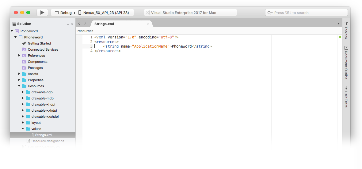 Expand the values node under the Resources folder in the Solution Pad and double-click the string resources file, Strings.xml: