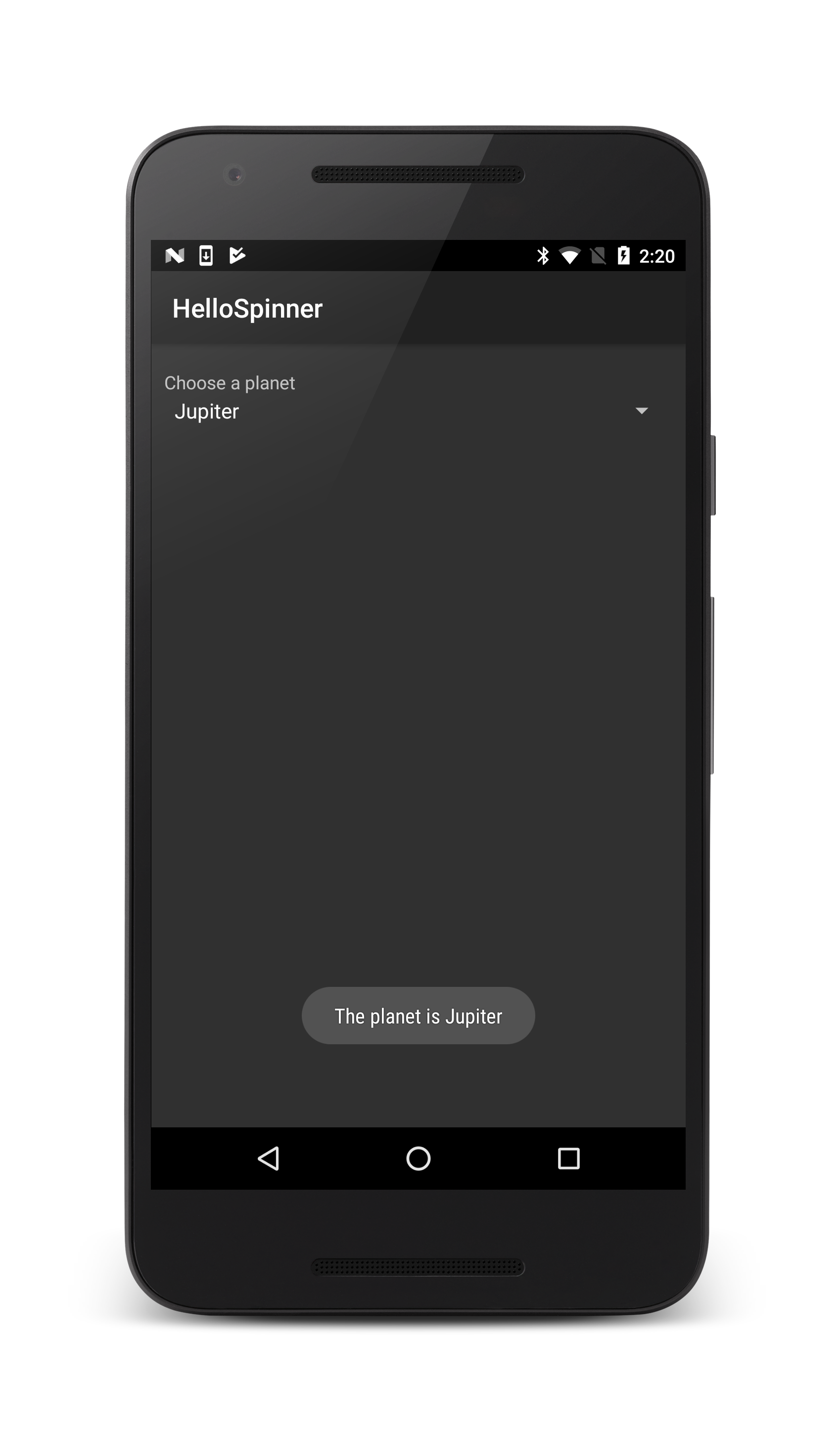 In the first part of this tutorial, you'll create a simple spinner widget that displays a list of planets. When a planet is selected, a toast message displays the selected item:
