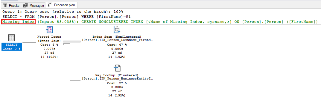 -- Captures the Total CPU time spent by a query along with the query plan and total executions SELECT qs_cpu.total_worker_time / 1000 AS total_cpu_time_ms, q.[text], p.query_plan, qs_cpu.execution_count, q.dbid, q.objectid, q.encrypted AS text_encrypted FROM (SELECT TOP 500 qs.plan_handle, qs.total_worker_time, qs.execution_count FROM sys.dm_exec_query_stats qs ORDER BY qs.total_worker_time DESC) AS qs_cpu CROSS APPLY sys.dm_exec_sql_text(plan_handle) AS q CROSS APPLY sys.dm_exec_query_plan(plan_handle) p WHERE p.query_plan.exist('declare namespace qplan = "http://schemas.microsoft.com/sqlserver/2004/07/showplan"; //qplan:MissingIndexes')=1Review the execution plans for the queries that are identified, and tune the query by making the required changes. The following screenshot shows an example in which SQL Server will point out a missing index for your query. Right-click the Missing index portion of the query plan, and then select Missing Index Details to create the index in another window in SQL Server Management Studio.