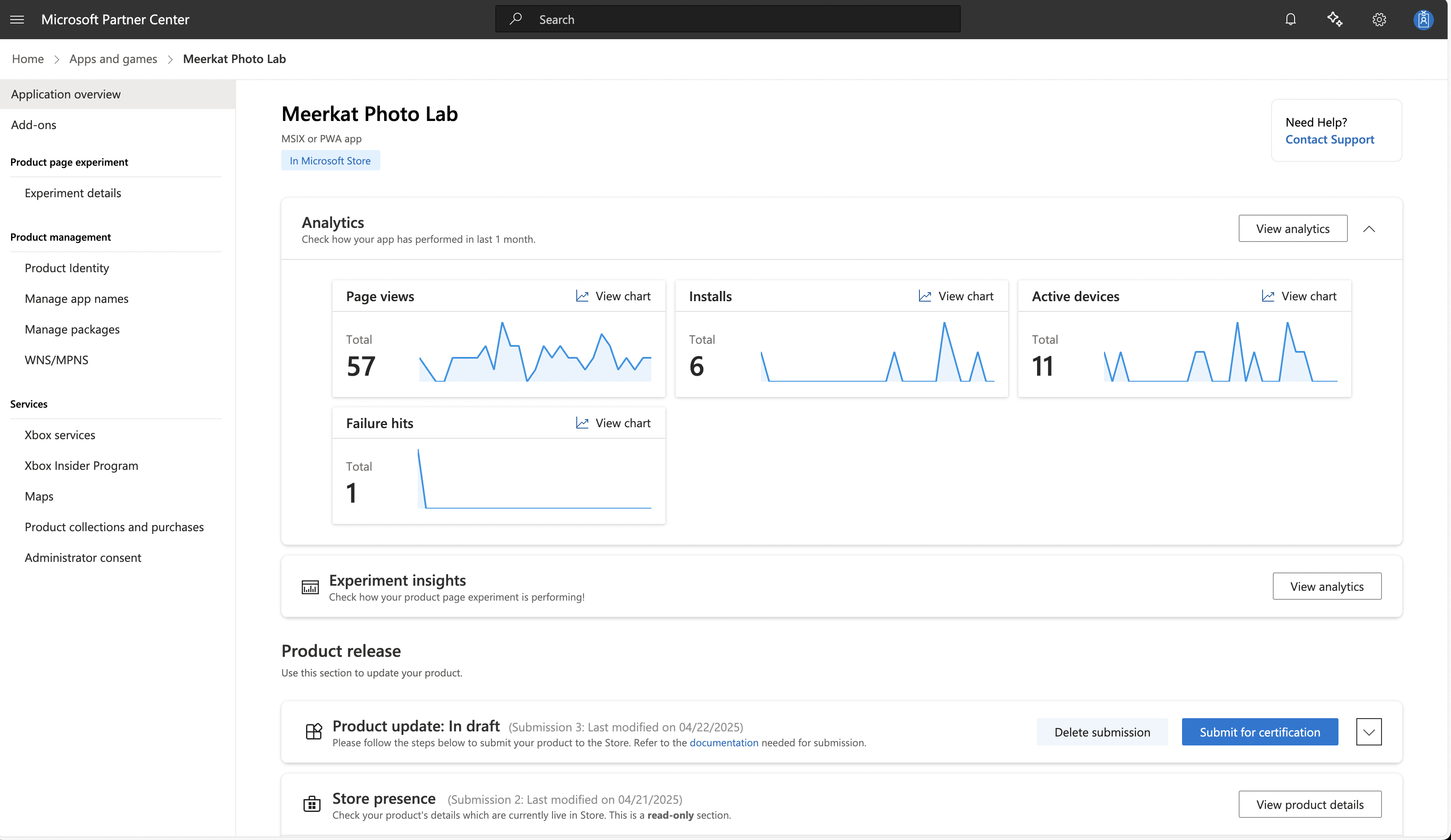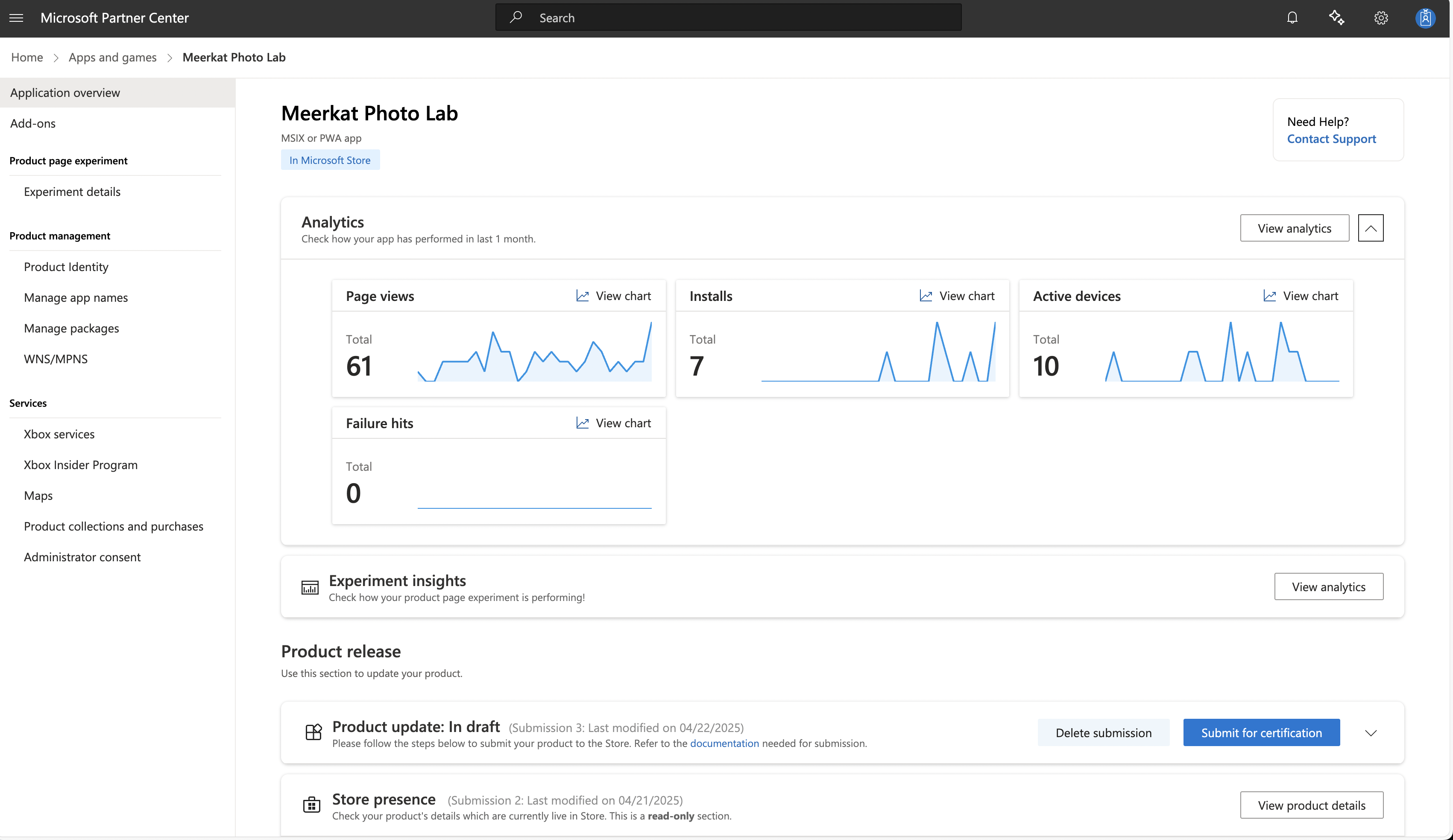 To conduct a product page experiment, start by signing in to Partner Center and selecting your app. This new overview page in Partner Center consolidates all app actions and information in one place. The console also contextually prioritizes information cards based on your app's status.
