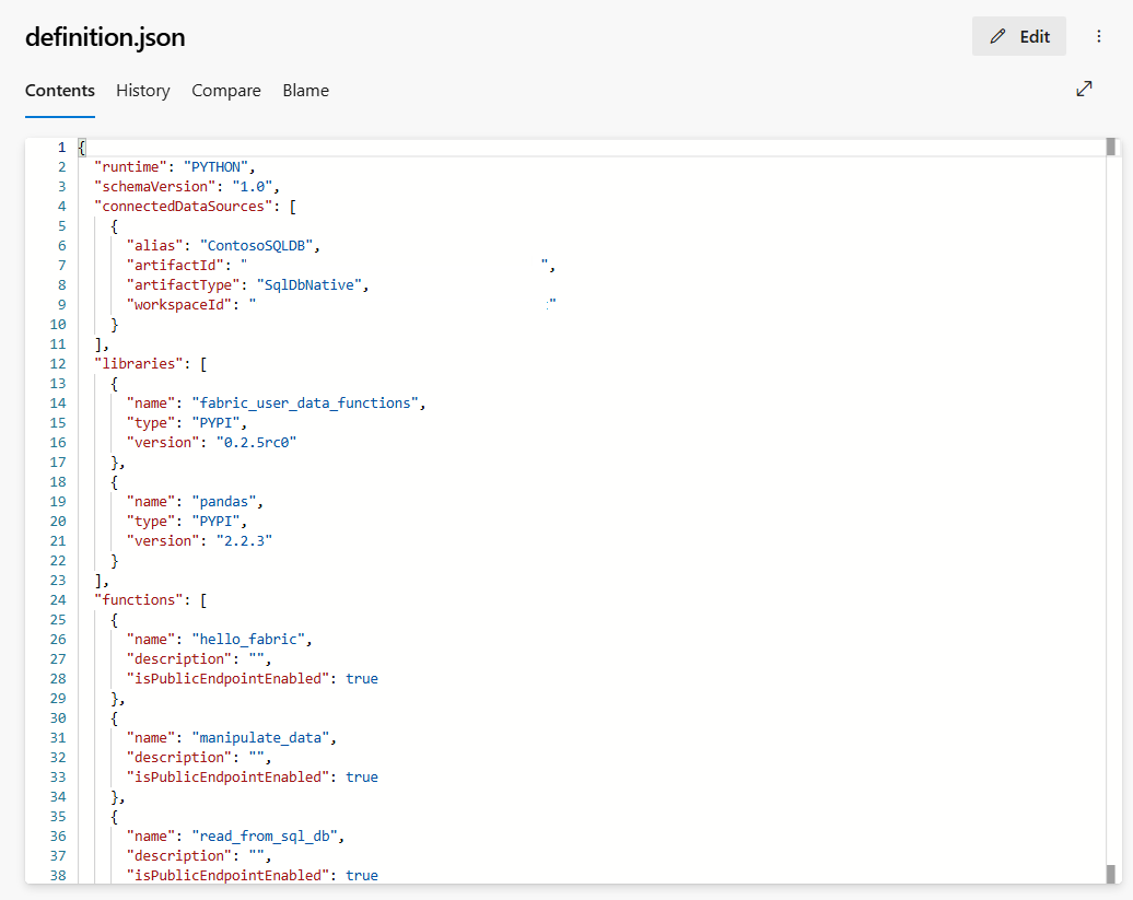 definitions.json: This file shares all the user data functions item definitions such as connections, libraries, etc. as a representation of the user data functions item properties.
