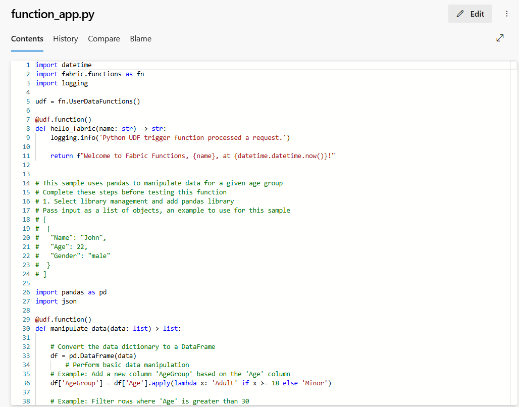 function-app.py: This file is your functions code. Any code changes you make to the user data functions item is synced into the repo with this file. You can perform various Git operations to manage the code development cycle.