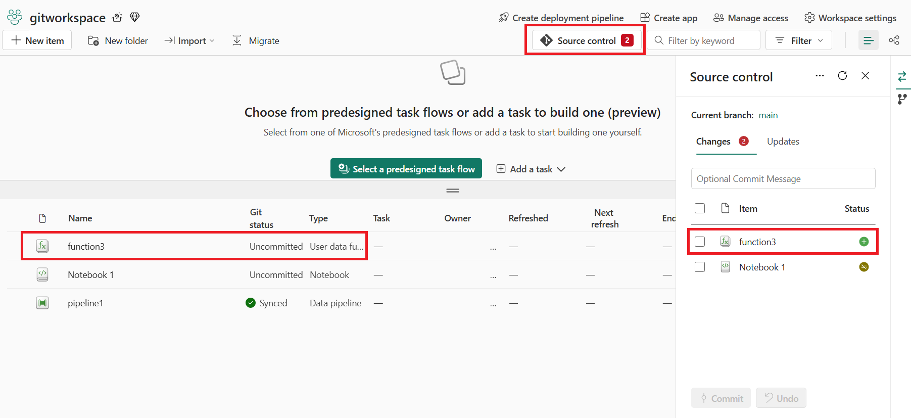 From your workspace settings, you can easily set up a connection to your repo to commit and sync changes. To set up the connection, see Get started with Git integration. Once connected, your items, including user data functions, appear in the Source control pane.