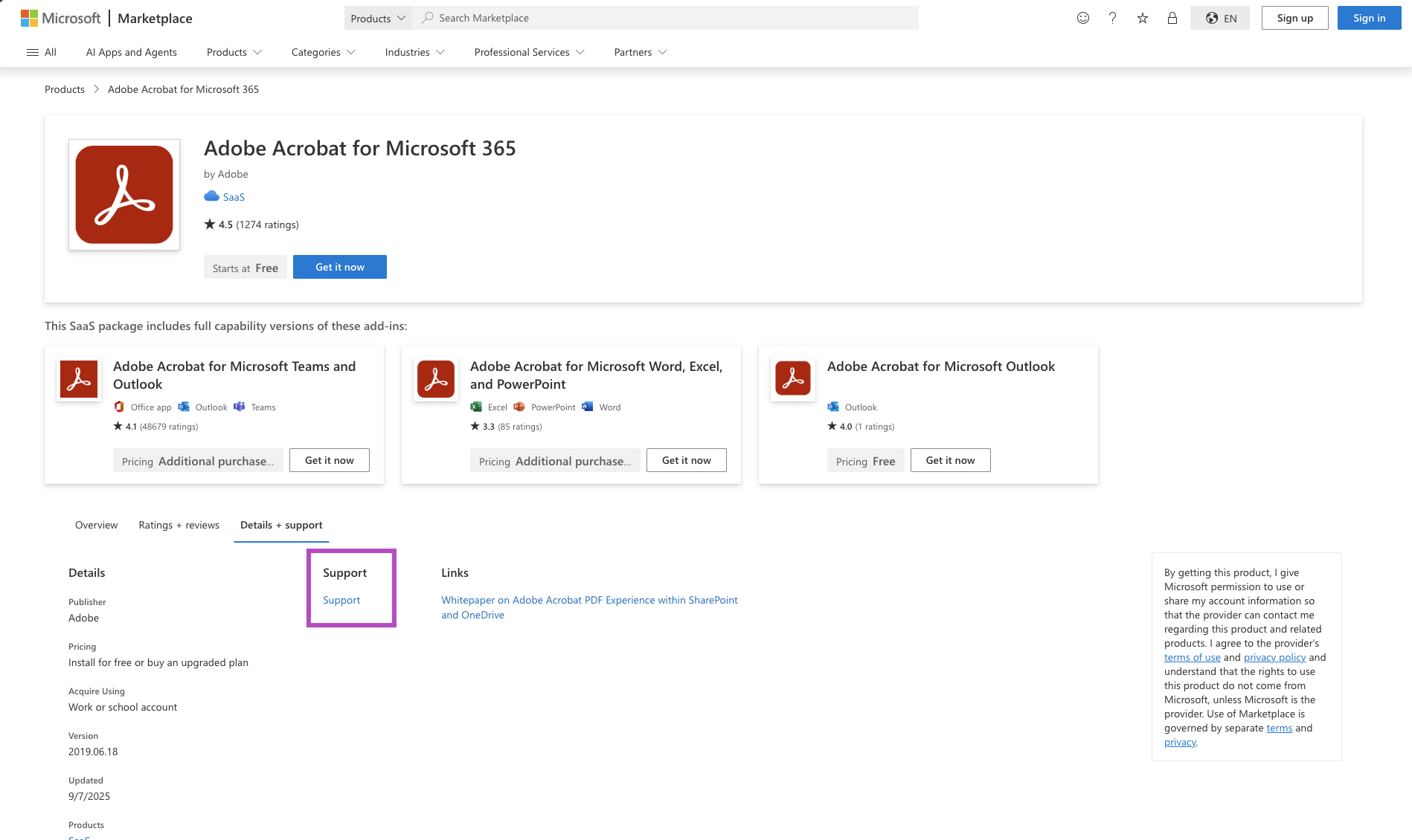 To get support for a product while you're in Microsoft Marketplace, select the support link on the left side of the offer page.