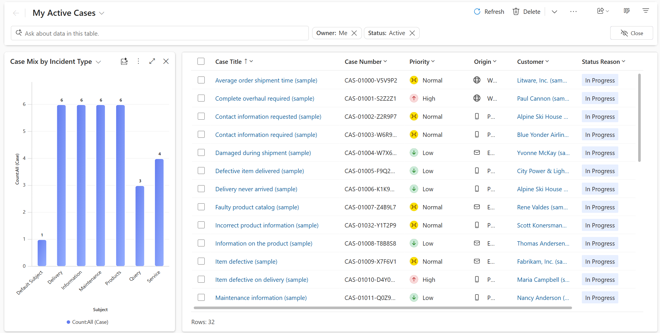 Atlasot Vizualizēt, blakus režģim tiek atvērta diagrammas rūts, kas papildina rindu tabulu. Ja tabulā ir sistēmas vai personiskās diagrammas, tiek parādīta tabulas noklusējuma diagramma. Ja tabulā nav diagrammu, Copilot ģenerē skata vizualizāciju, pamatojoties uz redzamajām kolonnām un filtriem. Vizualizācija ir diagramma, kas apkopo datus skatā.